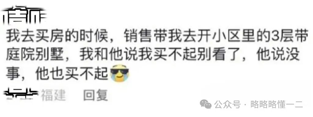 为了不浪费销售的时间,大学生也很坦诚,当销售带他去三层别墅区的时候,直接说自己买不起别看了,结果遇到了同样坦诚的销售,他也买不起。