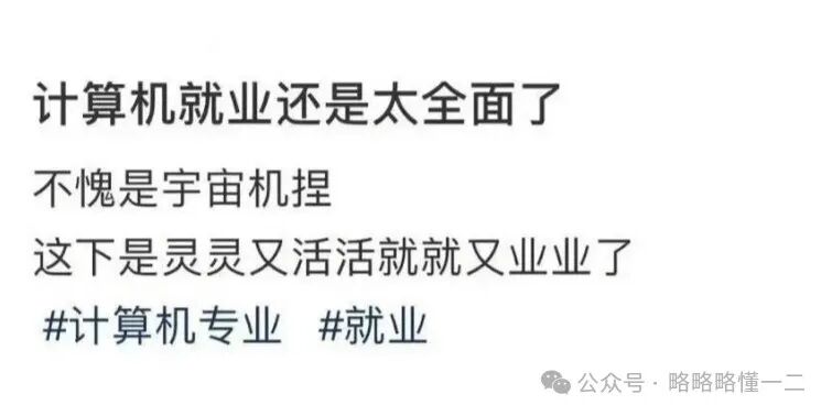但是不是侧面反映了一个事情,那就是计算机专业的大学生太全面了,没有不能胜任的岗位,就是对口就业有点难。