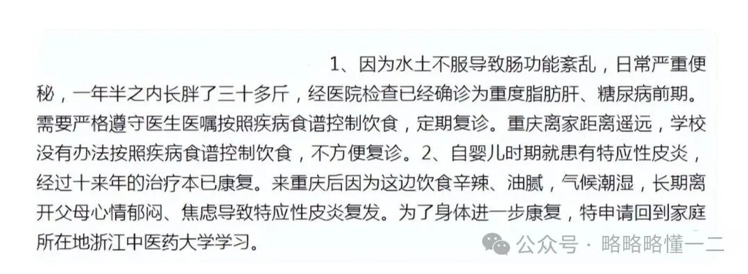 加上这名同学说小的时候还患有特应性皮炎,重庆气候潮湿,饮食辛辣,让他本来康复的特应性皮炎又复发了,为了身体的康复,想要回家乡杭州的浙江中医药大学学习。