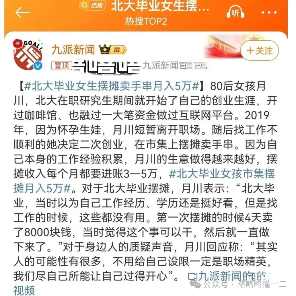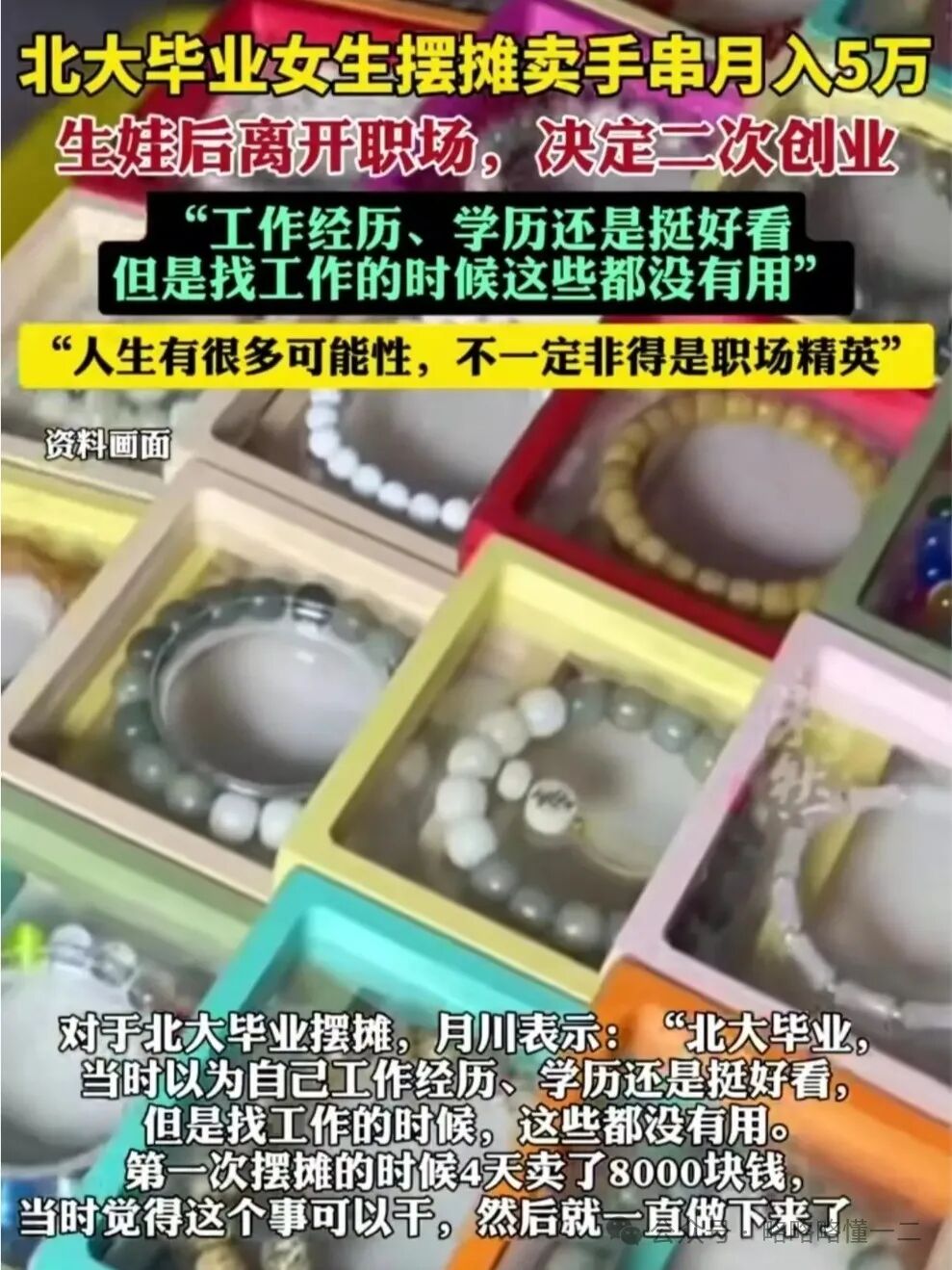 网友说重点就是想告诉大家“自谋生路”,就连北大毕业的学生都摆摊卖手串了,何况是普通双非院校的学生,还有一些专科生。