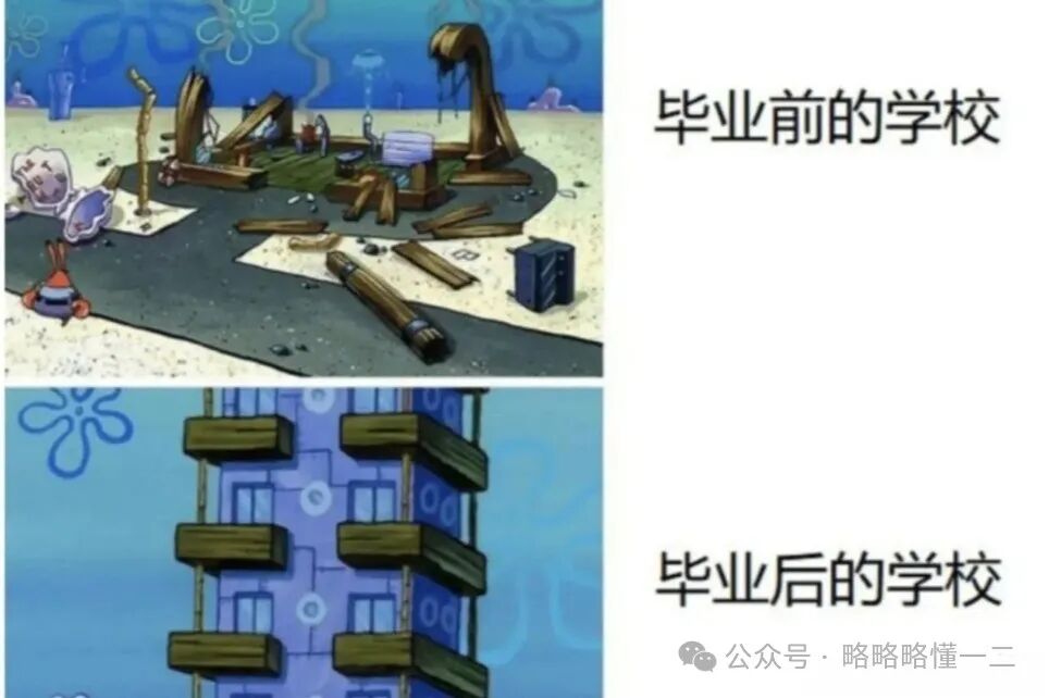 还有“毕业玄学”,这张梗图适用于大中小学校的学生,“毕业玄学”就是每逢自己毕业时,必定赶上学校的装修,等自己毕业离开这所学校了,环境和条件都改善了。