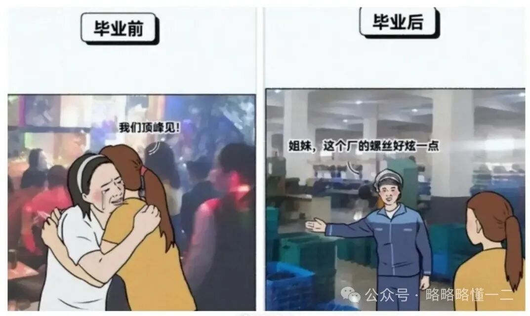 如果像这样能顶峰相见自然是很好的,同学们都有出息,自己的交际圈也会不一样,但事实情况是毕业后进厂打螺丝。