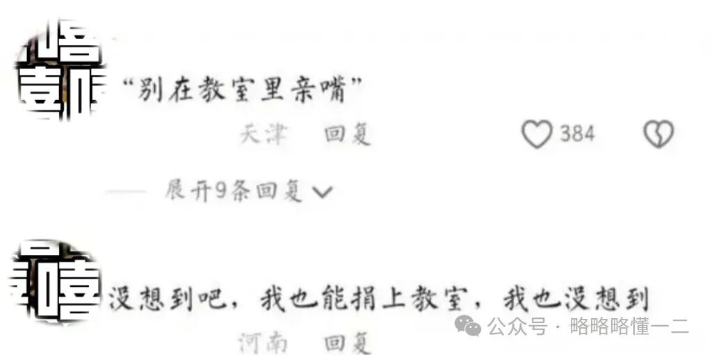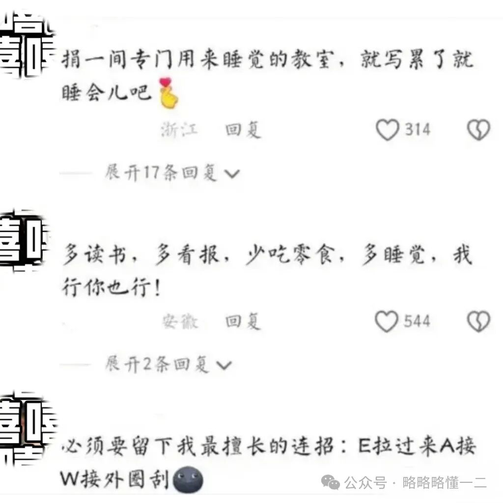 还有网友留言说:“多读书多看报,少吃零食多睡觉,我行你也行!”怎么感觉是好熟悉的台词?咱就是说都考上清华了,都能有实力捐赠教室了,能不能不这么搞笑啊?