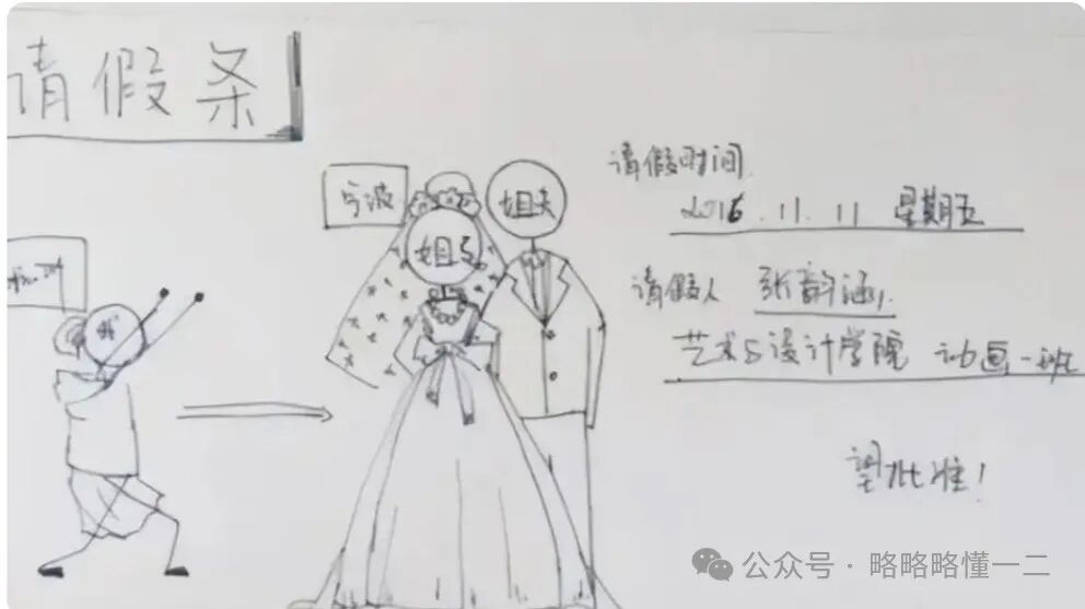 只是这请假条真的与众不同,不是写出来的,而是画出来的,画着姐姐和姐夫,旁边是她自己,这张请假条真对得起她的专业。