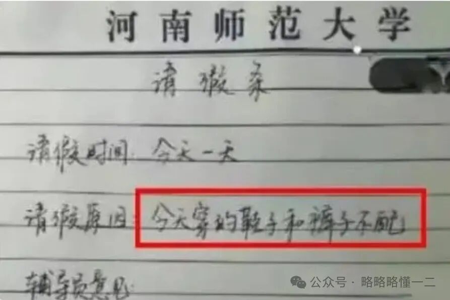 还有一言不合就请假类型的,理由奇葩到如果大家是老师的话,可能都没办法给批假的程度。大学生因为今天穿的鞋子和裤子不配套要请假,还要请一天的时间。