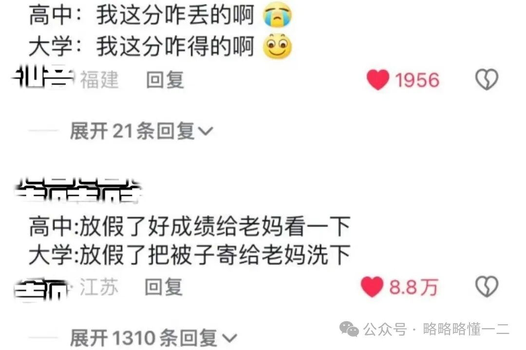 对于家长来说,也能感受到孩子上高中和上大学的变化,上高中时妈妈能收到孩子拿回来的好成绩,让妈妈这个后勤部也跟着高兴高兴。