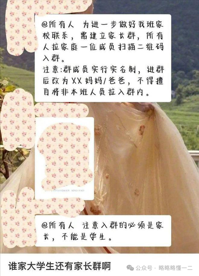 于是大学生之间互相充当对方的家长,混入家长群里,总之不想让自己的父母加入群里。
