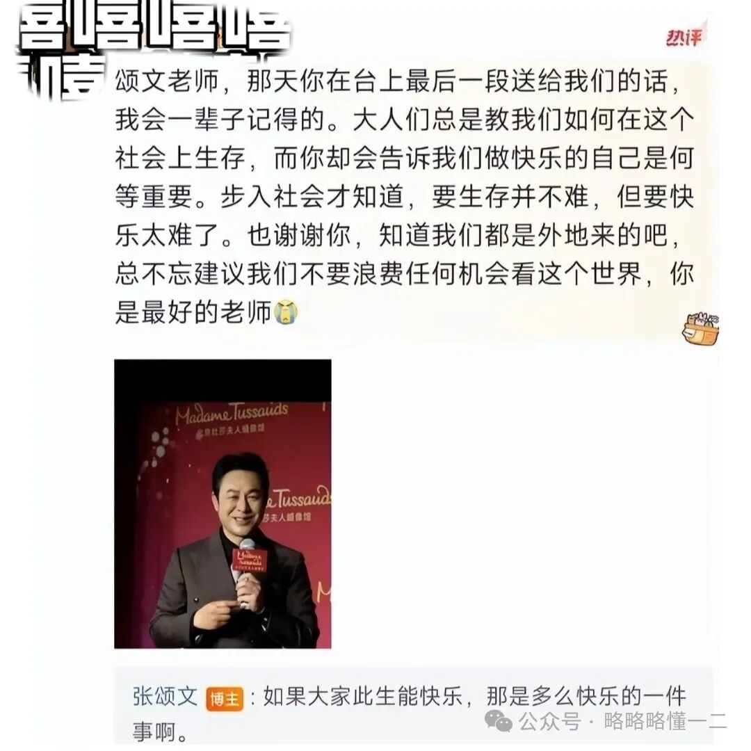 张颂文老师开导大学生就像是智者一样,让人有一种豁然开朗的感觉,他原本可以忽视掉大家的评论,毕竟身为公众人物经常回复普通人,还开导素不相识的人,这种情况真的不多见,而他做到了,笑笑看后都觉得生活充满希望和美好。