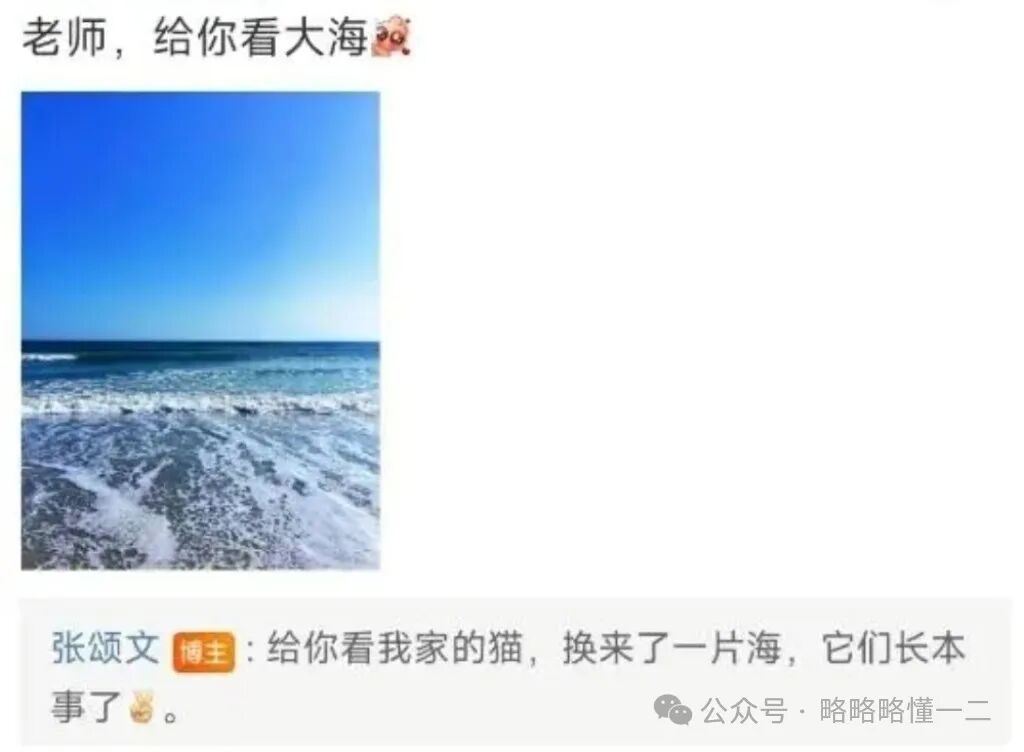 他的情商不是一般高,当有人给他评论了一张大海的照片让他看,结果他说:“给你看我家的猫,却换来一片海,它们长本事了!”这话听得真让人觉得舒适,要不张老师开设一个提升情商培训班吧!