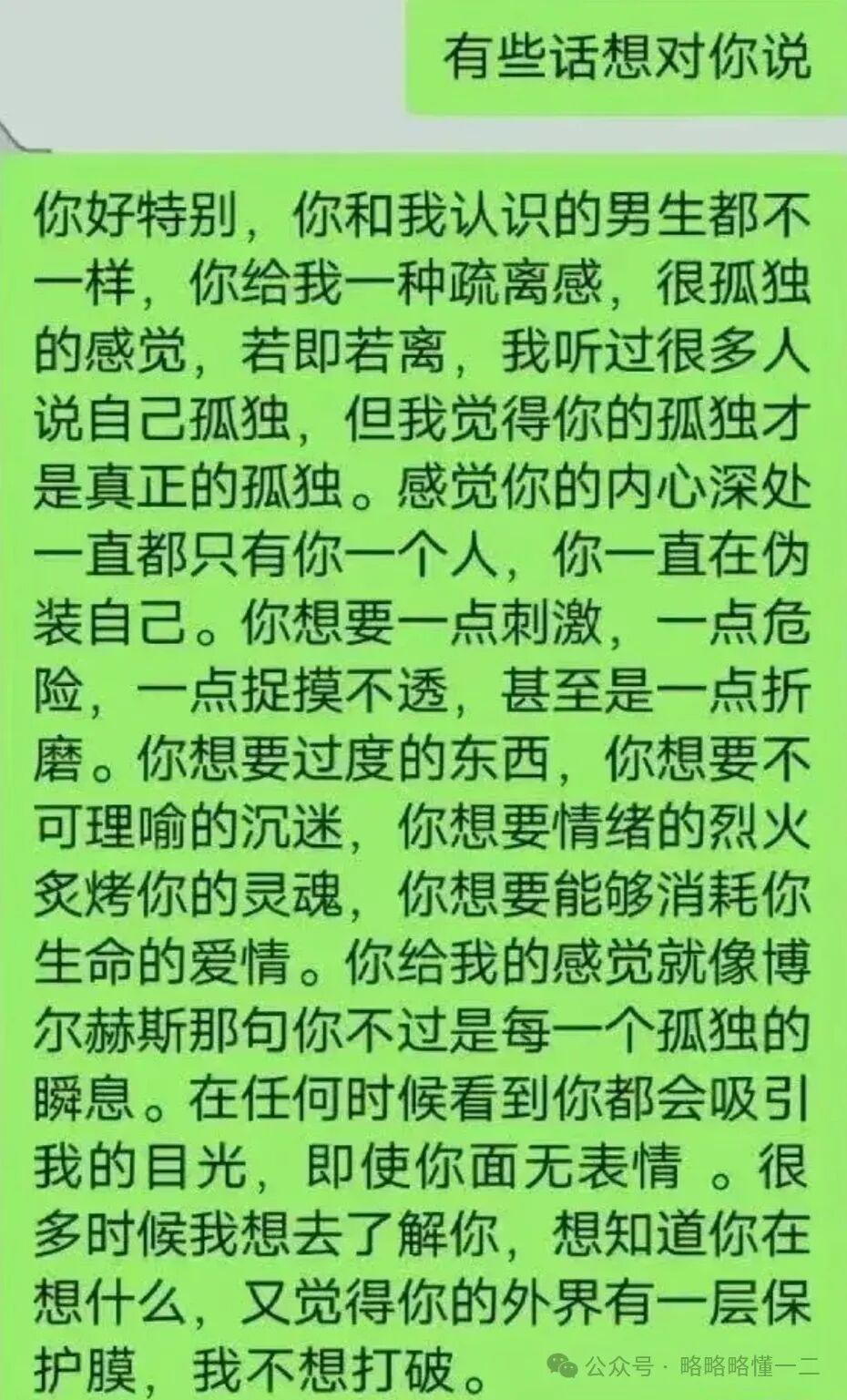 这名大学生就尝试给室友发了这样一段“小作文”,以“你好特别”四个字作为开头,先吸引对方注意力,然后再透过现象看本质,说一些不是从表象看人的话,还引经据典,引用了博尔赫斯的话:你不过是每一个孤独的瞬息!