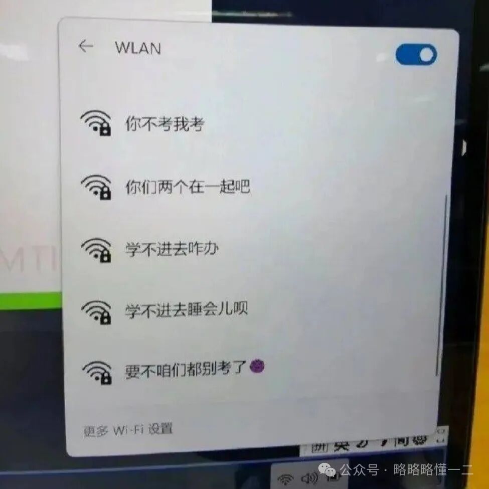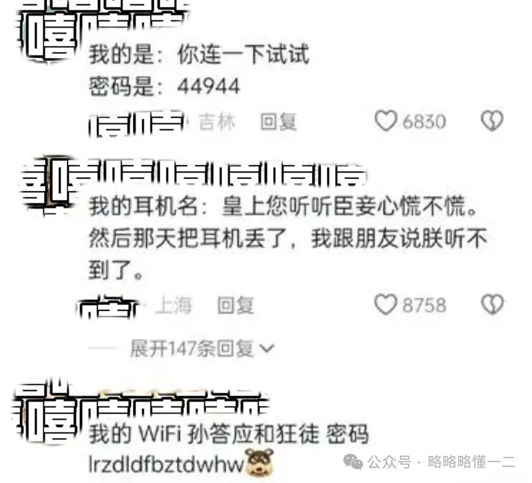 谐音梗也是起名字时必不可少的,比如热点名字叫“你连一下试试”,密码叫“44944(试试就试试)”,只要大家大胆尝试,说不定就能连上网了。