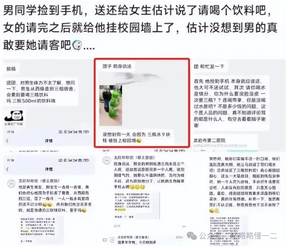 可能是大学校园距离也不算太远,反正最终还是给她送过去了,随后男生晒出了女生给他们买的水,三瓶三块钱的饮料,一共才九块钱,还值得被挂上墙墙,关键还是歪曲事实的。