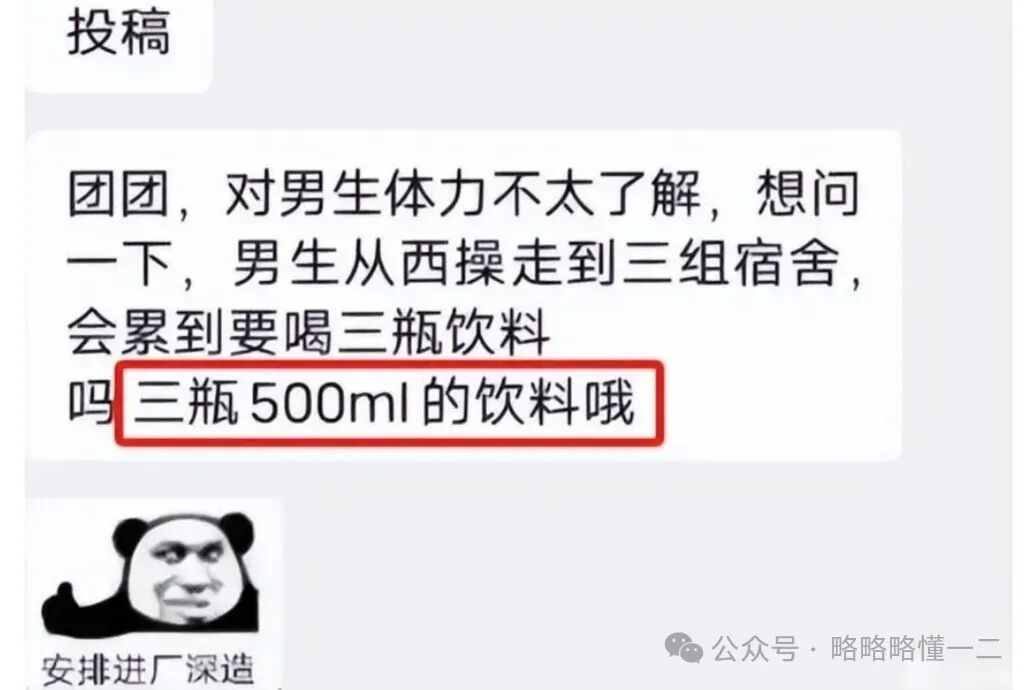 在女生的手机失而复得后,女生在学校校园墙上说对男生的体力不太了解,想问一下男生从西操走到三组宿舍,会累到要喝三瓶500毫升的饮料吗?