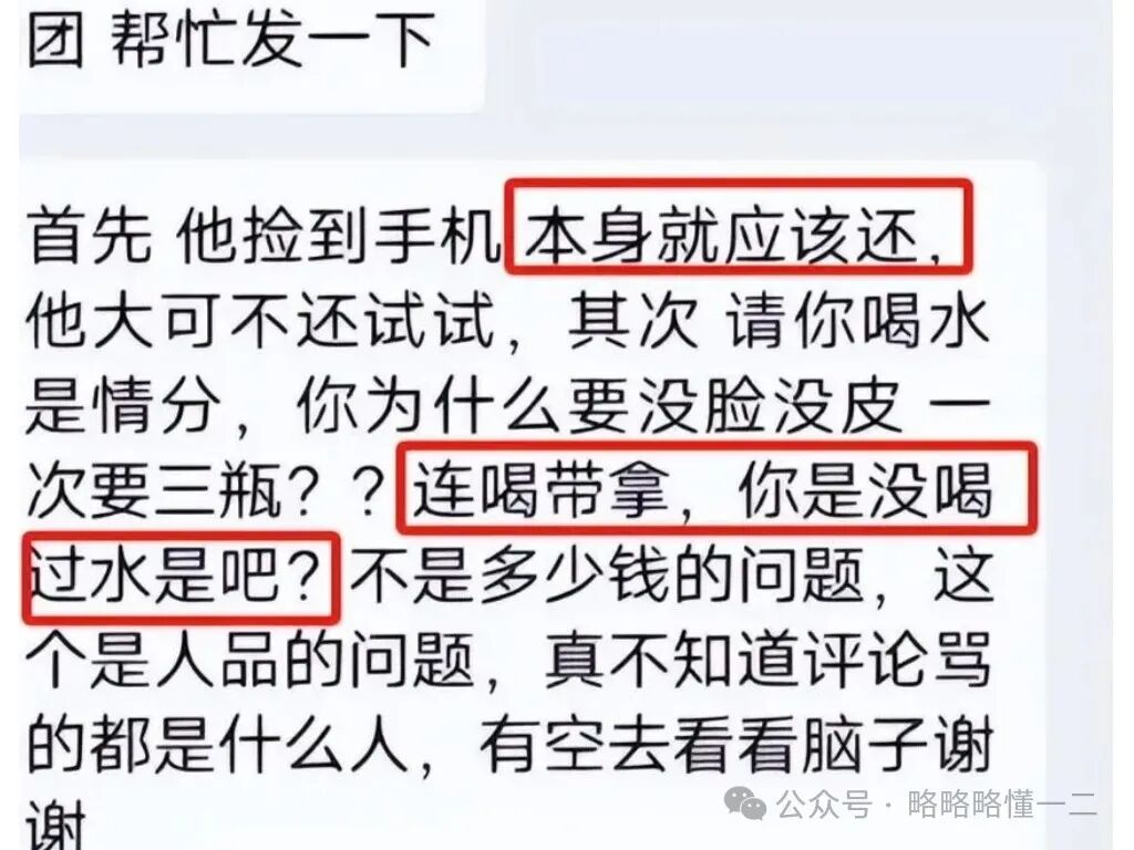 网友们也表示不太理解,网友说如果是自己的手机丢了,别人走那么远的路还给送回来了,要是给买饮料的话都觉得对不起人家走的路,高低也得请人家吃顿饭。