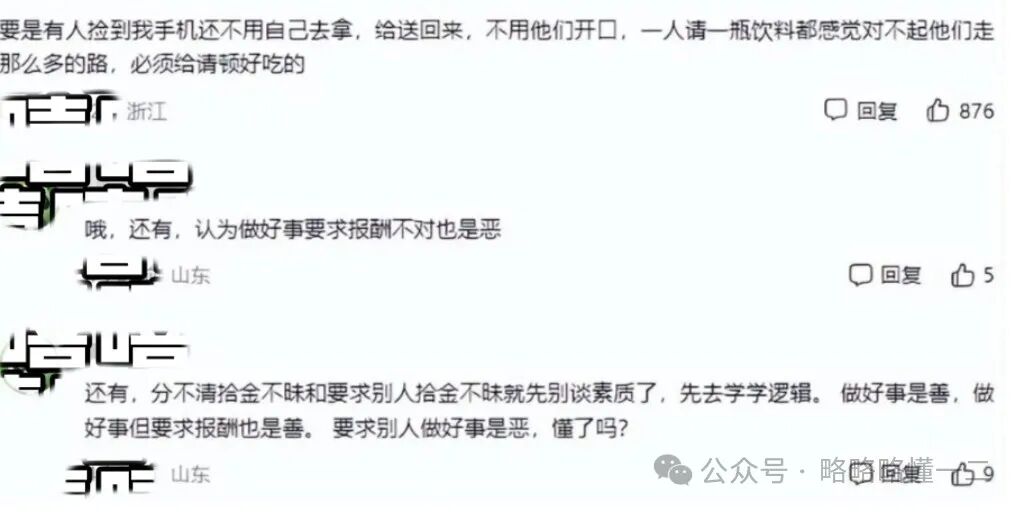 还有网友说做好事是善,做好事要求报酬也是善,但要求别人做好事是恶,分不清拾金不昧和要求别人拾金不昧就先别谈素质了,先学学逻辑。