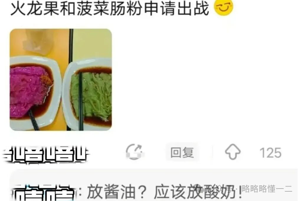 食堂阿姨改成了火龙果肠粉和菠菜肠粉,总感觉火龙果还是当水果的时候好吃,做成其他美食在视觉上就给大家很大冲击。