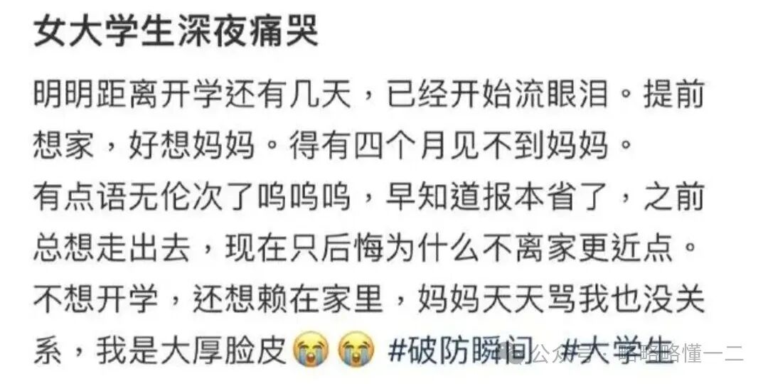 有的大学生想家到受不了,已经情绪崩溃了,半夜痛哭流涕,这名同学还不是在本省上的大学,想到四个月见不到妈妈就受不了。