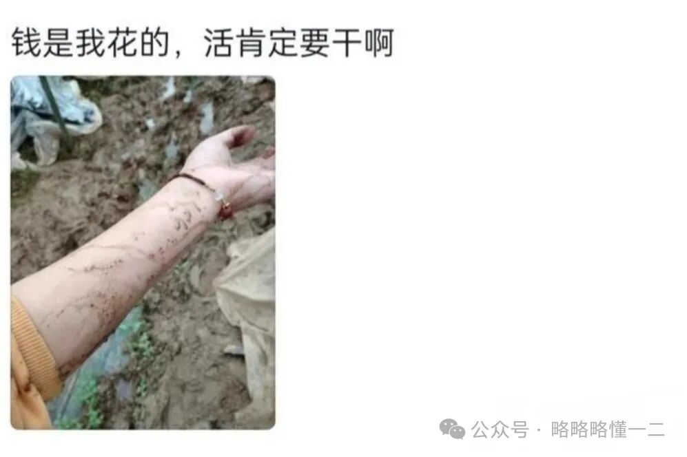 大学生晒自己劳动时手臂的图片,我们可以清晰地看到大学生手臂上的泥,而大学生却说:“钱是我花的,活肯定要干啊!”