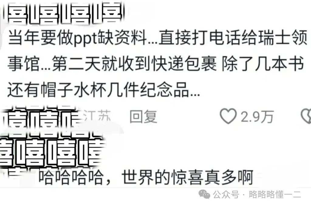 这个世界的惊喜可真多,学生做汇报PPT需要资料,打电话给瑞士领事馆寻求帮助,第二天收到了快递包裹。