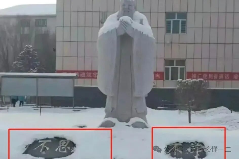 在孔子大教育家的雕像下面,只有“不思”和“不学”两个字没有被雪覆盖,其余的字下面都有雪覆盖,形成了鲜明的对比。
