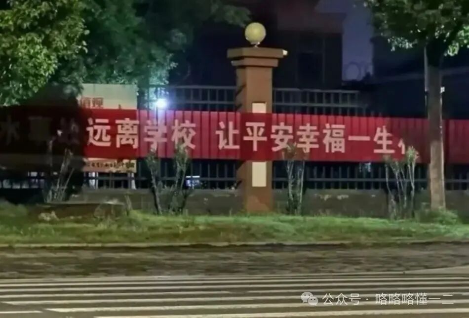 还有被树遮挡后的条幅,剩下的内容狠狠让学生共情了。剩下了“远离学校,让平安幸福一生”。学生:你要是这么说的话我可走了!要去过平安幸福的一生。