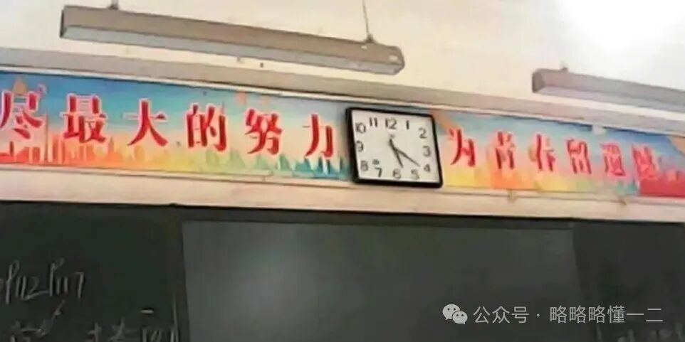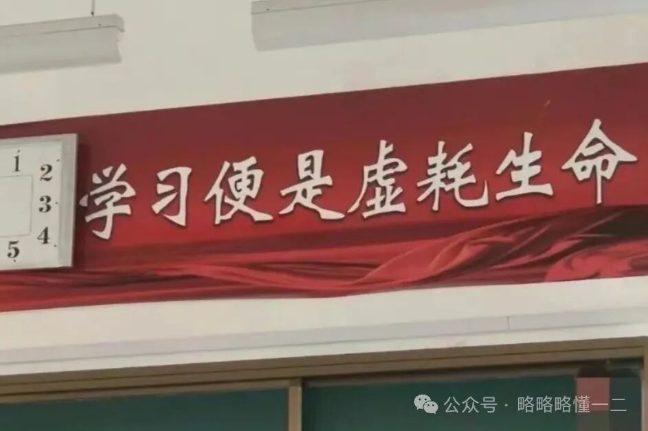 都是因为时钟的位置惹的祸,这条条幅上写着:“应最大努力为青春留下遗憾”,这是什么话?要为青春留下遗憾,还得是尽最大努力,未免有些太荒谬了。