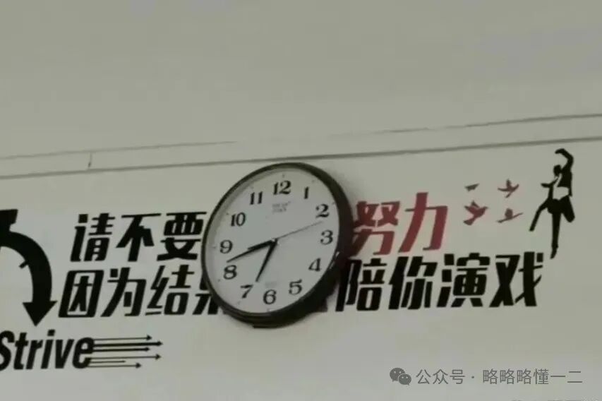 比如有了钟表的遮挡,条幅内容就不完整了,变成了“请不要努力,因为结果陪你演戏”,这是看一遍笑一遍的程度。