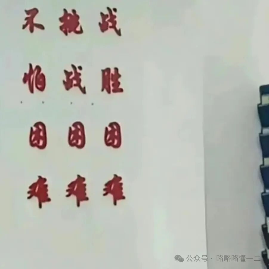 还有的班级会在墙上贴标语,按照我们正常的思维,在读的时候是不是应该竖着读,应该是“不怕困难、挑战困难、战胜困难”。