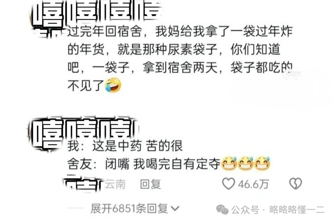 网友说过完年带了一大袋子年货回学校,就是那种装尿素那么大的袋子,而是有两天就解决了,最后吃的连袋子都不见了。