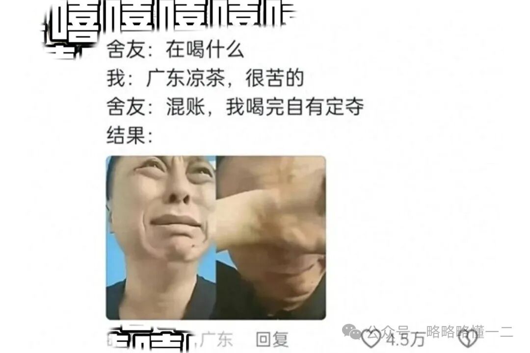 结果被苦成“痛苦面具”,那也没关系,关键是我得尝尝。你别说是广东凉茶了,哪怕是中药,也要喝两口试试味儿。