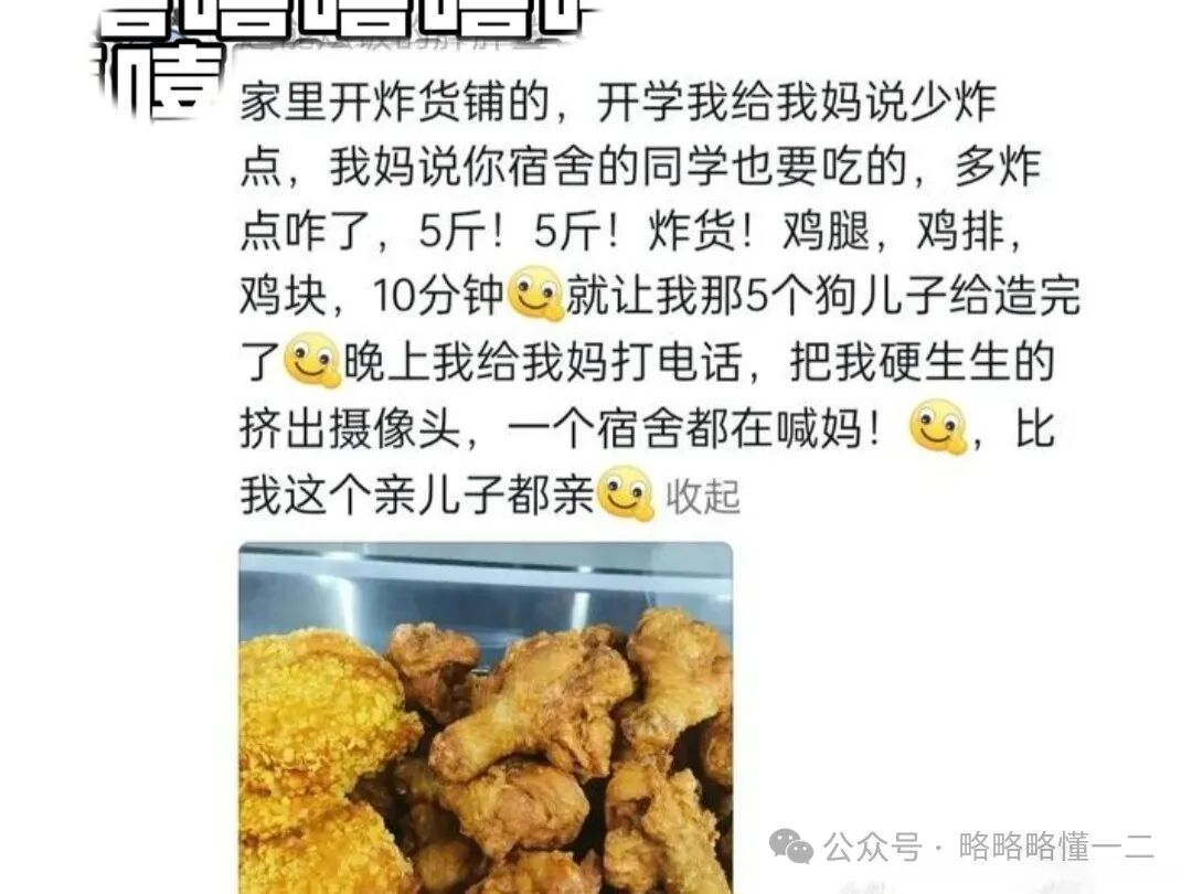 结果回到学校十分钟就被室友都吃光了,晚上给妈妈打电话时,把他这个亲儿子都挤出镜头外,整个寝室都在喊妈,叫的比他这个亲儿子还亲。