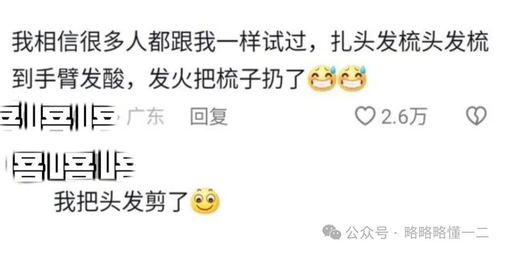 还有情绪不太稳定易怒型的大学生,扎头发梳头发手臂酸了,直接把梳子扔了出去,还有同学更狠,把头发剪了,这多少有点极端情绪在里面了。