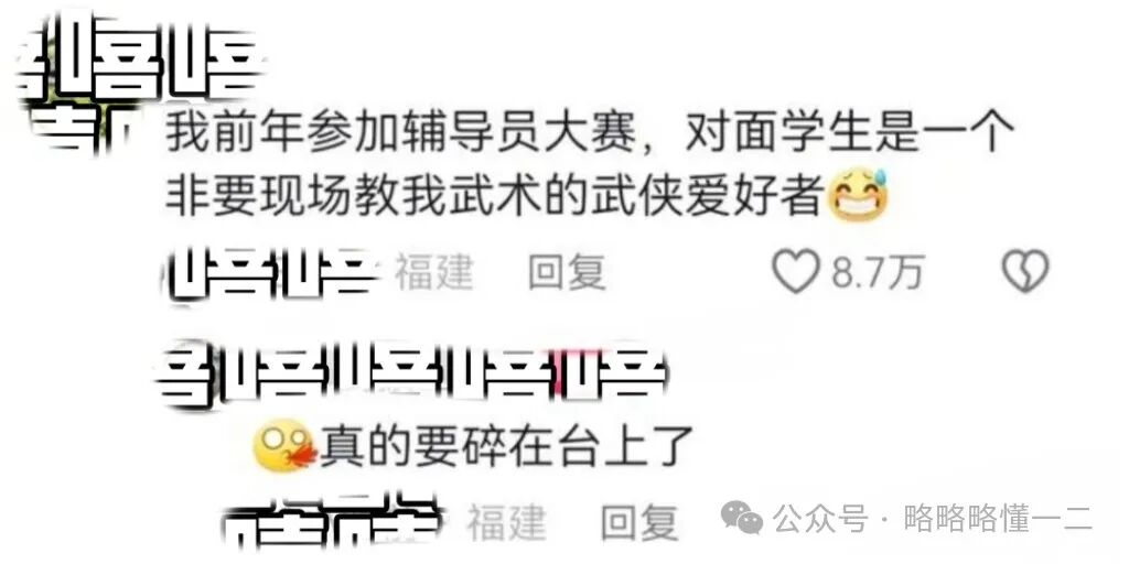 评论区真有辅导员参加过这个比赛,对面的学生是一个非要现场教他武术的武侠爱好者,真的要碎台上了,只能硬着头皮跟学生做。
