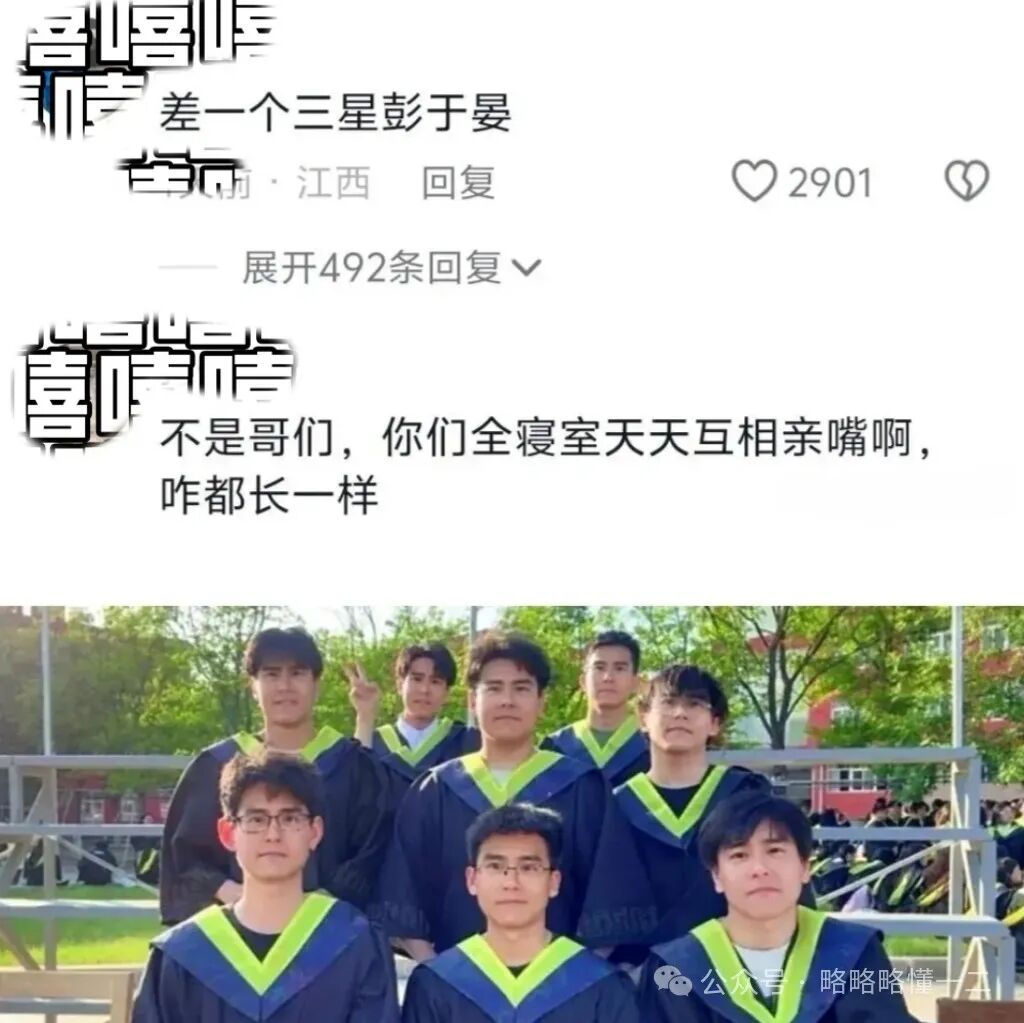 有一名同学在网上分享了自己和室友的毕业照,让大家感到非常惊讶,因为他们寝室里的几个人长得实在是太像了。于是有网友说你们寝室天天亲嘴吗?怎么大家都长一样?
