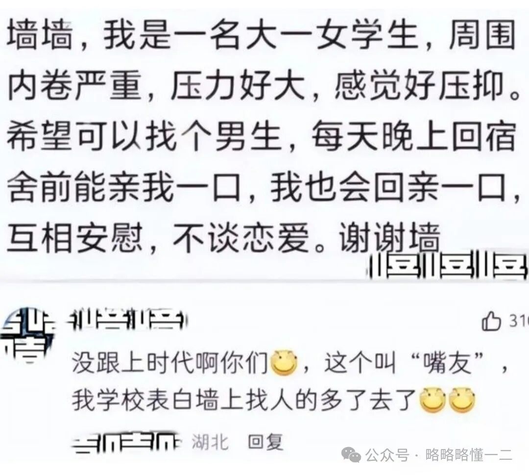 关键是不谈恋爱,就是“嘴友”,炸裂程度让人觉得有点儿跟不上时代的步伐了,已经开始流行这个了吗?略略表示,大学之大,无奇不有。