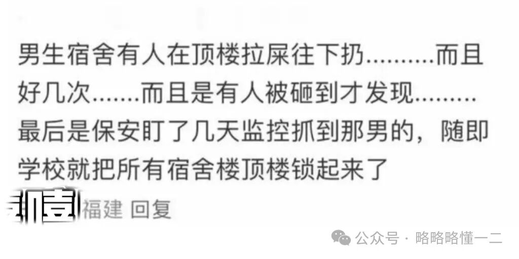 网友说男生宿舍有人在楼顶上完厕所,把“答辩”往下扔,有人被砸到了才发现这种行为。