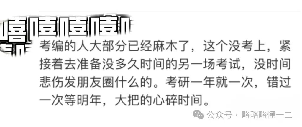 还有网友是从时间安排上来分析的,网友说考公考编的人如果一次没有考上,接下来就会研究参加其他的考试,只要时间不冲突就可以去参加,根本也没有时间发悲伤的文案。