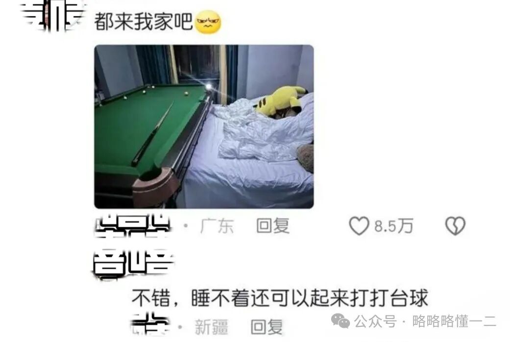 大学生热情邀请大家都来他的家,睡不着的时候还能起来打打台球,倒也是一个不错的选择,存在即合理,父母这么放,一定就是有他的道理的。