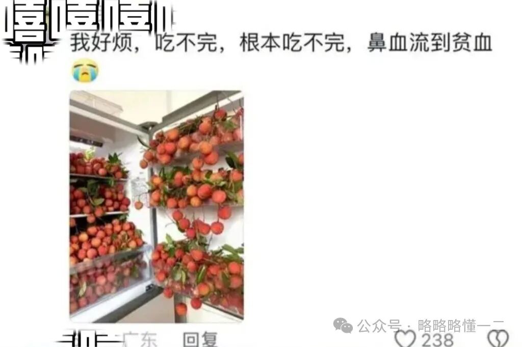 吃不完到什么程度,鼻血流到贫血。都说过量吃荔枝会上火,北方人:我能吃多少荔枝,不至于上火的程度,这下吃荔枝过多一下就有了具象化。
