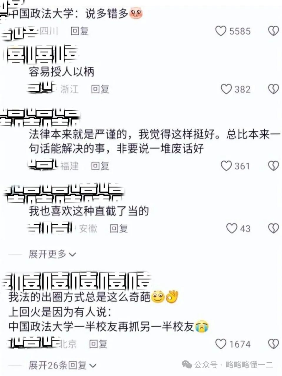 还有网友说中国政法大学之所以这样表述,是因为说多错多,本来法律就是严谨的,一句话能说明白的事情,总比说一大堆废话强。