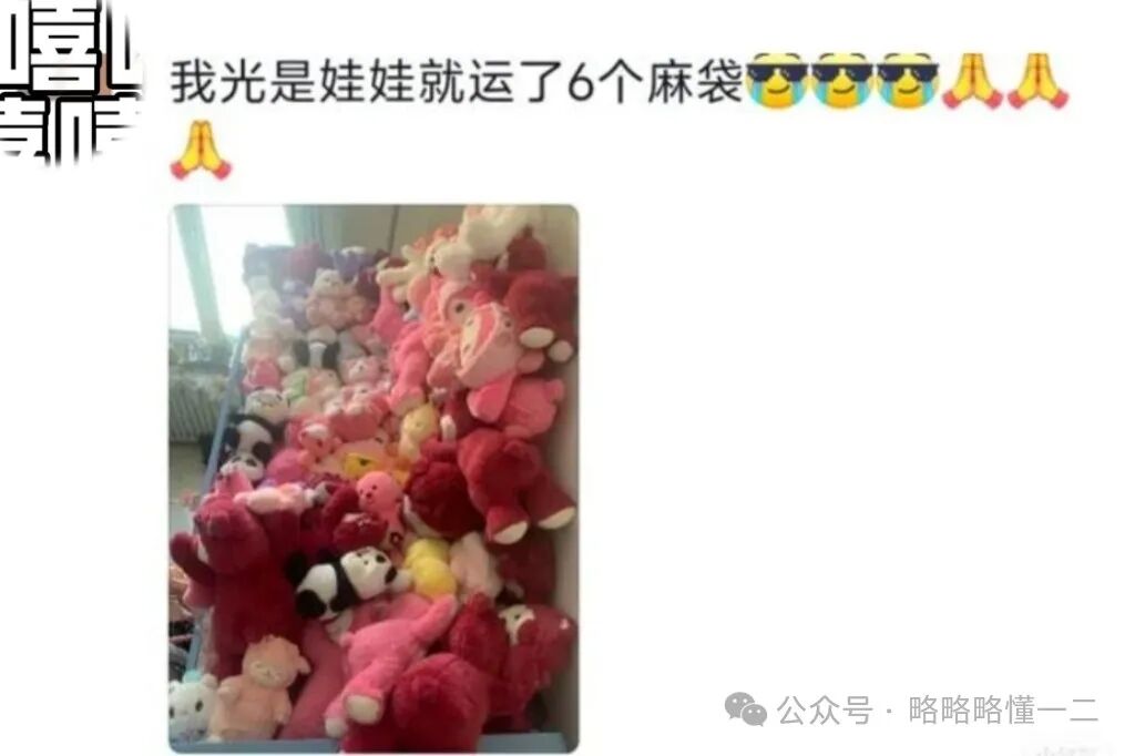 咱也不知道大学生大学四年为什么会有六麻袋的娃娃?是不是平时玩抓娃娃很厉害,都可以开娃娃店了,这么一看确实很壮观,而且很治愈,只是搬到家里需要耗费不少体力吧?