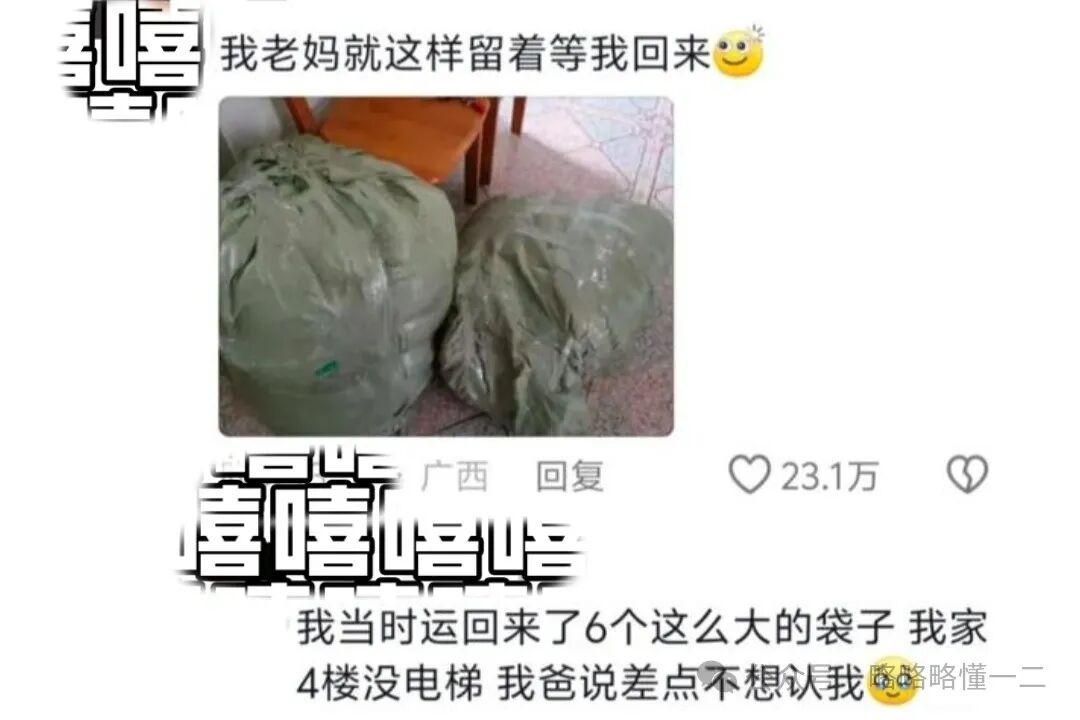 有大学生说自己当时回家就有六个这么大的袋子,他家在四楼还没有电梯,爸爸当时差点都不想认他了,可以理解爸爸的心情,没有电梯谁能受得了啊?