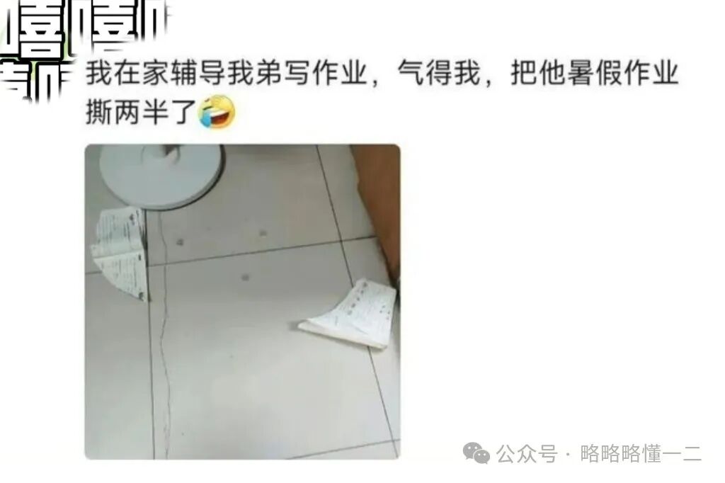 还有大学生在家辅导弟弟写作业的,情况也不怎么样,看来 大学生还不能很好地管理自己的情绪,因为大学生把弟弟的暑假作业给撕成两半,这孩子是有多难辅导啊?
