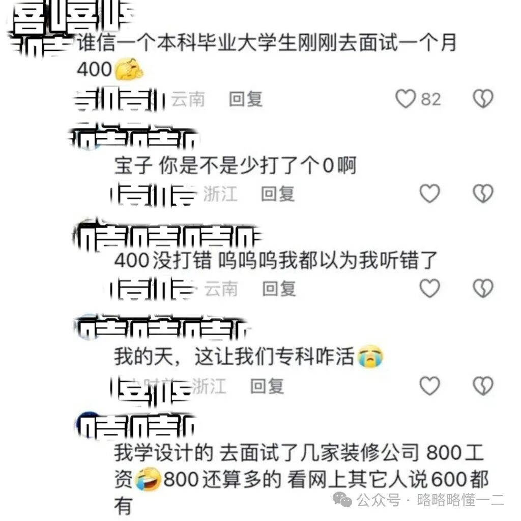 评论区里有学设计的同学说面试装修公司,给800都算多的,网上还有给600的,不敢想象这是现在的工资水平,大学毕业生是不是也不甘心去就业呢?