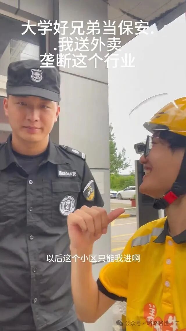 两个人偶遇后都笑了,没想到两个人现在一个是保安,一个是外卖员,在小区门口偶遇了。随后大学生还和同学开玩笑说以后这个小区的外卖只能由他来送,把这个行业垄断了。
