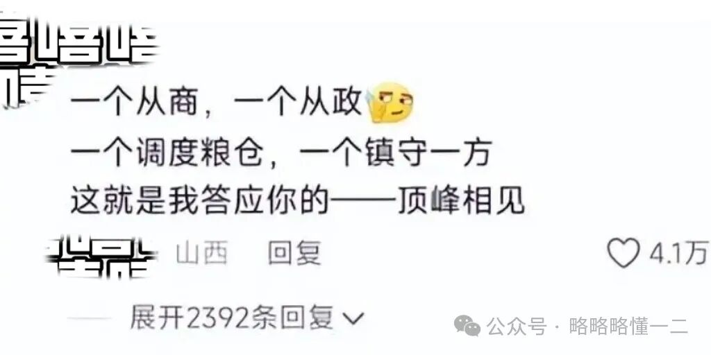 网友对此的评论也很有意思,网友说两个人一个从商,一个从政,一个调度粮仓,一个镇守一方,这不就是当初在一起说的顶峰相见吗?让网友这么一说,还真是挺高级的。
