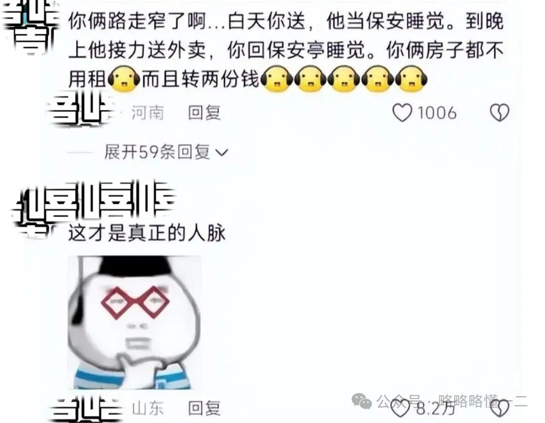 还有网友给出谋划策的,网友说他俩可以轮流当保安,轮流去送外卖,这样还能在保安亭里休息,挣两份钱,连租房子的钱都省了。