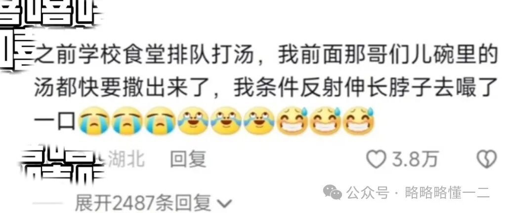 有时候条件反射这件事情挺坑人的,这名大学生在食堂里排队打汤,看到前面同学的汤快要洒出来了,于是他条件反射赶紧上前去嘬了一口。