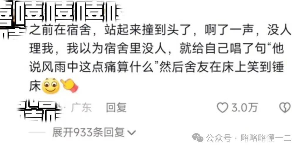 大学生在宿舍一不小心撞到头了,叫了一声寝室里却没有人理他,就觉得寝室里没有人,决定给自己唱首歌安慰一下自己,来了一句“风雨中这点痛算什么”,结果室友笑到捶床。