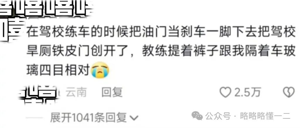 关键是直接的受害者是他的教练,教练提着裤子跟他隔着车玻璃对望,教练:我当时吓坏了。别人教车要钱,我教车你要我命啊!